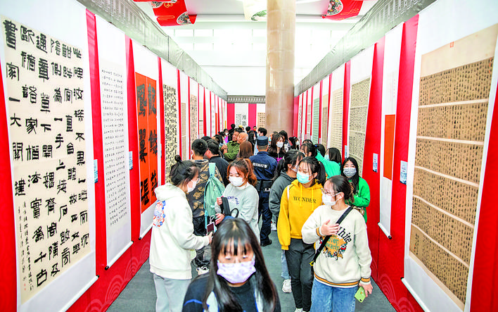 10月21日,观众在观看“卫夫人书法”全国书法篆刻作品展。 当日,作为第二届山西(夏县)卫夫人书法艺术节的重头戏,第二届“卫夫人书法”全国书法篆刻作品展、“江山如此多娇”毛主席诗词书法名家作品展、第二届“溯源传承”卫氏后裔书法作品展和“厚韵夏都·翰墨传承”夏县书法作品展同步开展。形式多样、内容丰富的优秀书法篆刻作品,吸引了众多观众驻足欣赏。