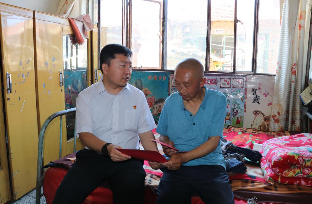 慰问组走进93岁高龄的苏喜春家中,为生活困难的老同志送去党组织的关怀。居住在女儿家中的苏喜春,一直扎根基层,是右玉第一代农信人,现退休已有三十余年。如今,苏老行动不便,虽然无法用言语表达,但可以读书看报。当看到总行工会冯主席递到手里的慰问信和慰问金时,满眼含泪,点头示意后,颤抖的双手捧起慰问信认真看起来,边看边笑。慰问组叮嘱其家人,要努力让老同志晚年生活过得更加幸福舒心,有困难找党组织。