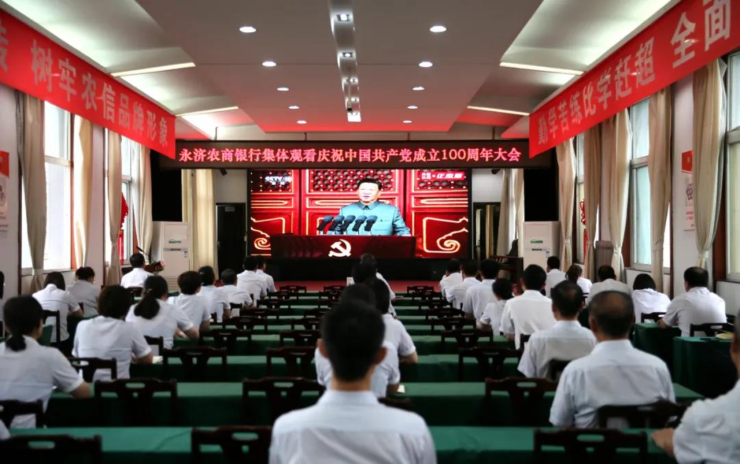 上午8时,庆祝中国共产党成立100周年大会在北京天安门广场隆重举行,中共中央总书记、国家主席、中央军委主席习近平发表重要讲话。永济农商银行组织全体员工通过多种方式集中观看庆祝中国共产党成立100周年大会盛况直播,聆听习近平总书记发表的重要讲话,感受党的百年光辉历程。