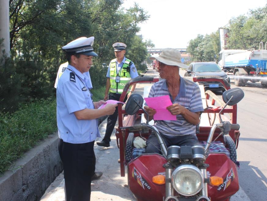 整治行动中,该队在辖区主要路段和重要路口,通过固定检查和巡逻查处的方式,重点查纠三轮车违法载人、无牌无证、非法改拼装等交通违法行为,做到发现一起,查处一起,绝不姑息,切实打击三轮车违法行为,并对查处的三轮车两侧喷涂“严禁载人”警示标识。同时,执勤民警采取处罚与教育宣传相结合的方法,对查处的违法载人三轮车及骑乘摩托车不戴安全头盔的违法行为,向乘车人员耐心讲解三轮车违法载人和安全头盔的危害性,宣讲应知的交通安全法律法规和安全常识,切实提高了群众的知法守法知晓率,使群众从思想上引起重视,起到警示教育效果。