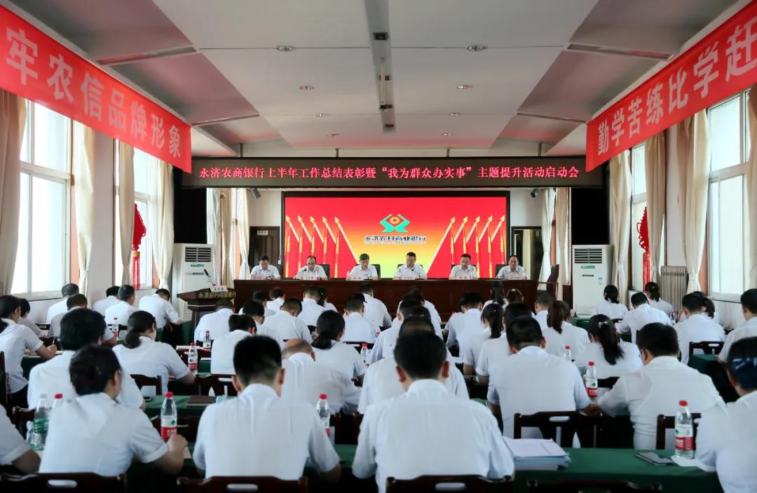 本网讯(王文福)7月14日,永济农商银行在五楼会议室召开2021年上半年工作总结表彰暨“我为群众办实事”主题提升活动启动会,总行在家班子成员、中层正副职参加会议。