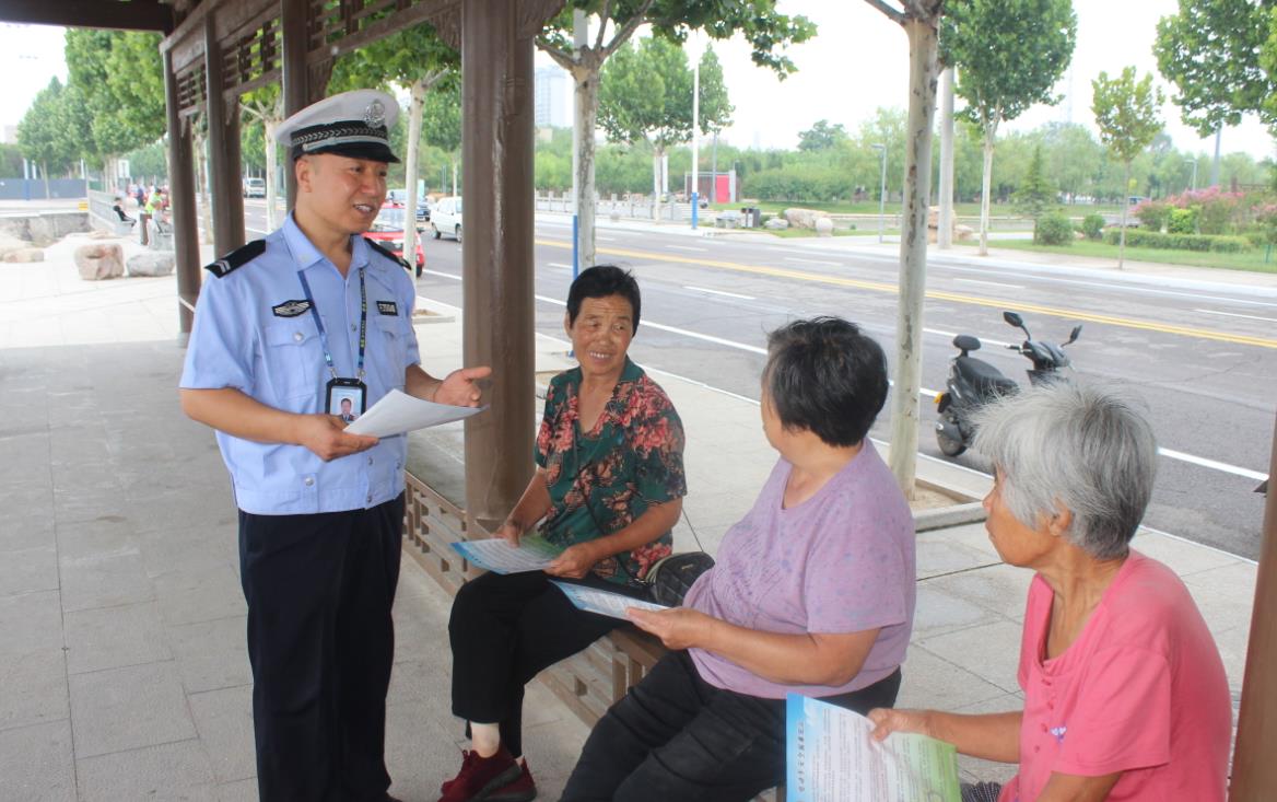 民警通过面对面发放宣传材料的方式,向在广场锻炼和休闲的群众散发宣传资料,广泛宣传交通违法行为的危害性和普及道路交通法律法规知识,结合辖区道路交通事故案例,以案说法,讲解无牌无证、酒后驾驶、骑摩托车不戴头盔、农用车违法载人的危害性和法律责任,倡导他们遵守交通法规,安全文明出行。