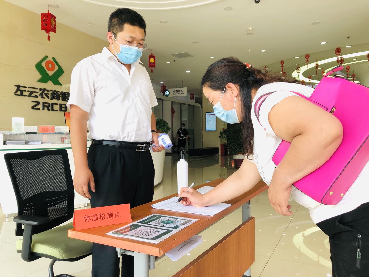 左云农商行坚持以人为本,把员工和客户生命安全和身体健康放在首要位置,提前为各个网点配备口罩、消毒液、体温枪等防疫物资,要求在岗员工务必佩戴口罩上岗,每日要坚持对办公区域、智慧柜员机、自助设备、密码键盘等区域进行班前、班中、班后的全面消毒工作,确保安全“无死角”。大堂经理积极引导前来办理业务的客户进行基本信息登记,并做好体温测量、“两码”检查等工作。在现金管理方面,全面做好收支两条线,对外付出现金使用金库统一配送且经过消毒的现金,对于客户存入的现金,统一进行消毒杀菌,切实提高客户和现金流转各环节人员的安全性。
