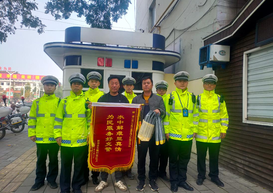 10月23日,新绛县东榆村张红卫将一面印有“水中解难显真情,为民服务好交警”的锦旗,亲自送到稷山县公安局交通管理大队城区中队岗亭,交到帮助他的执勤民警手中。