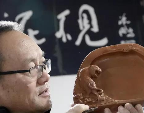 国家级非遗——绛州澄泥砚省级传承人、中国制砚艺术大师、民盟新绛支部副主委、新联会会长蔺涛在修饰“虎啸风生”生肖虎绛州澄泥砚。