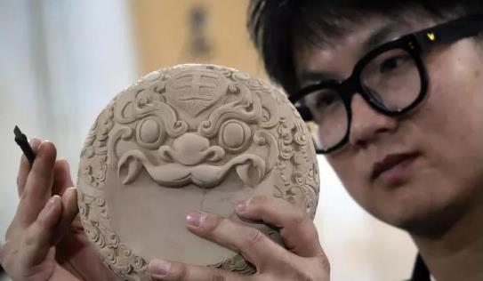 国家级非遗——绛州澄泥砚第三代传承人、新绛县新联会理事蔺子麟在雕修“虎虎生威”生肖虎绛州澄泥砚。