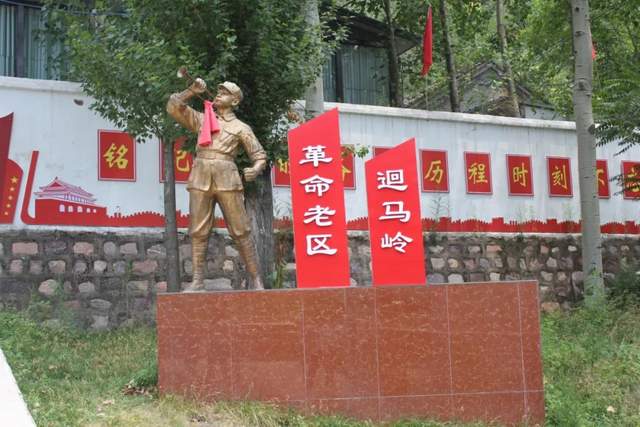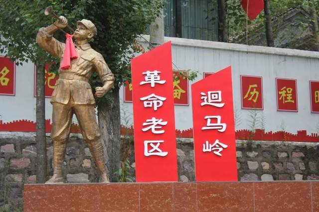 六月的迴马岭草木青葱百花绽放,一座挽起袖口、吹着冲锋号的塑像威武雄壮,红底白字的“革命老区迴马岭”赫然入目。