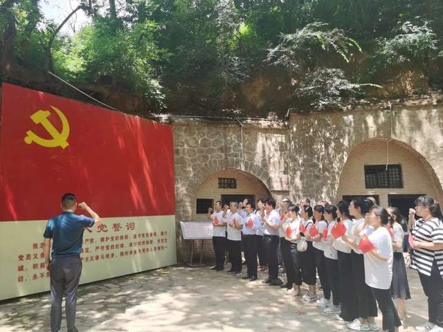 在革命先辈们曾经战斗和生活过的窑洞前,全体党员面对鲜红的党旗庄严宣誓,重温入党誓词。铿锵的声音穿越时空久久回荡……