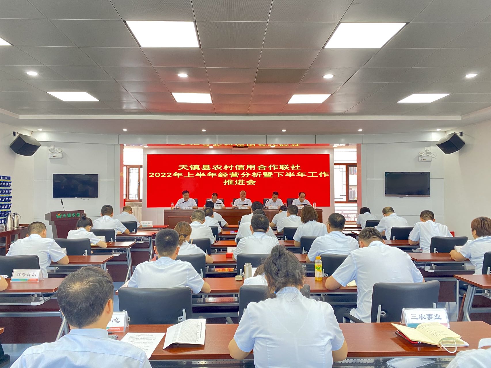 本网讯(通讯员 苏超)7月25日下午,天镇县联社党委班子在联社五楼会议室组织召开2022年上半年经营分析暨下半年工作推进会,各网点、科、部(室)负责人共40余人参加会议,会议由联社党委副书记、主任高卫东主持。