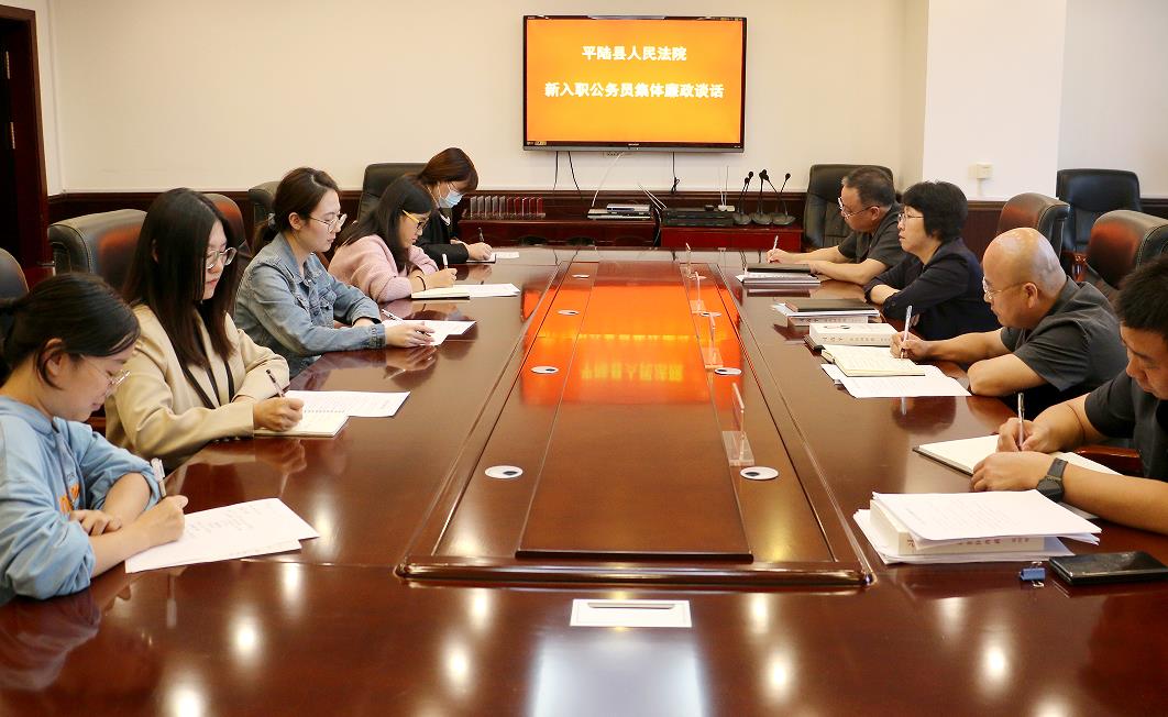 本网讯(通讯员 毛春芳 )为进一步强化新入职公务员的廉洁自律意识,帮助新入职公务员扣好廉洁从政的“第一粒扣子”,切实提高拒腐防变和履职尽责能力,8月30日下午,平陆法院召开新入职公务员集体廉政谈话会。党组书记、代院长程丽珍出席并讲话。