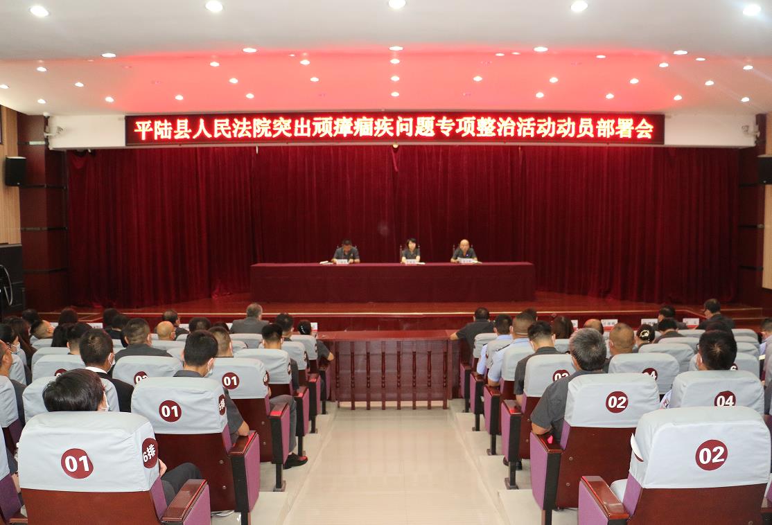本网讯(通讯员 毛春芳)为进一步巩固政法队伍教育整顿成果,推动顽瘴痼疾常治长效,根据《山西省政法系统常态化开展执法司法顽瘴痼疾排查整治工作的意见》和《运城市政法系统突出顽瘴痼疾问题专项整治活动实施方案》精神,9月19日下午,平陆法院召开突出顽瘴痼疾问题专项整治活动动员部署会。全院干警参加会议。