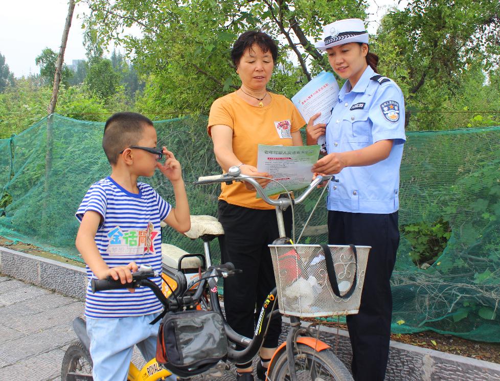 初秋时节,每天清晨和下午,都有许多老年人带着孙子在公园游玩,他们有的骑着电动车带着孩子,有的和孩子各骑一辆自行车,一前一后或并行驶,有的则或抱着、或拉着孩子在游玩,公园北边与育英街相通,车辆行人不断,时有孩子在道路上嬉戏打闹,存在很大安全隐患。宣传中,民警通过发放宣传资料等形式,向老年人宣传出行时应注意的交通安全常识,告诉他们带孩子上路要在道路的右侧行走,不逆行和乱穿马路,过马路走斑马线,对骑乘电动车的老年人,则告诉他们驾驶电动车要自觉佩戴好安全头盔,带小孩时,配好儿童座椅,谨慎驾驶,安全出行。