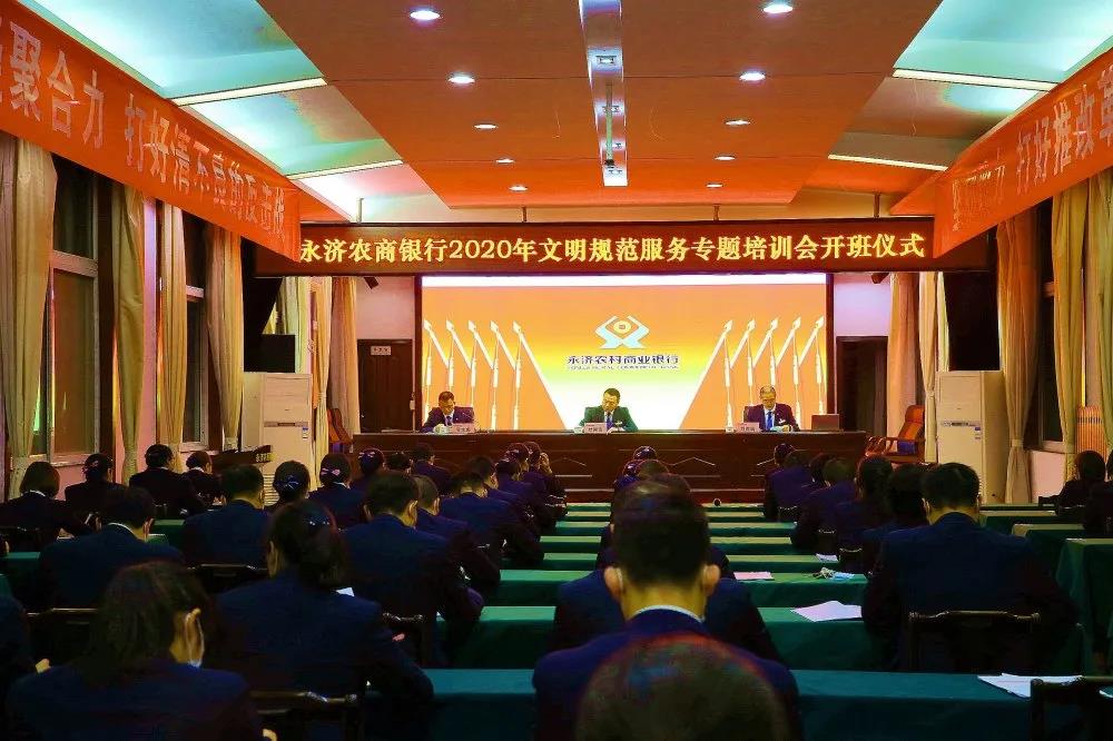 本网讯(王文福) 10月19日晚,永济农商银行在五楼会议室,举行2020年度文明规范服务专题培训开班仪式,并进行第一期专题培训。党委副书记、行长杜国强,分管行长、部分部室经理、网点正、副职、客户经理、营业经理、综合柜员及大堂经理共计70人参加。