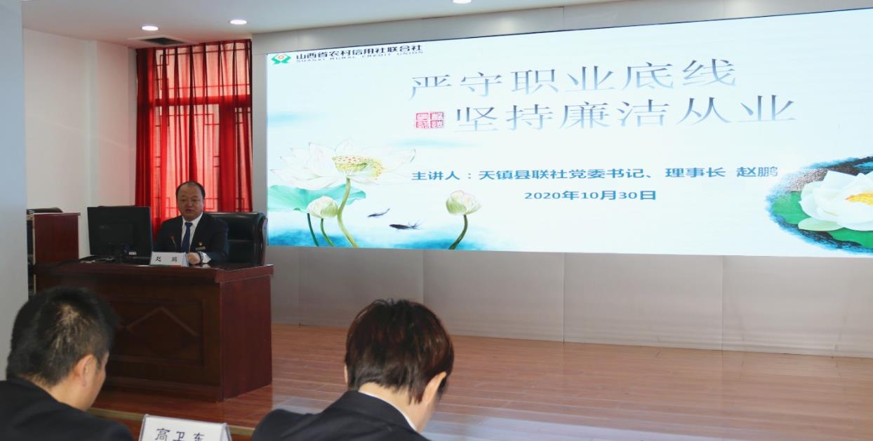 本网讯(通讯员 薛文娟)为积极响应省联社大同审计中心全面创建学习型机关的要求,10月30日,天镇县联社开展以“严守职业底线 坚持廉洁从业”为主题的专题教育讲座,联社全体干部职工参加此次廉政教育学习。