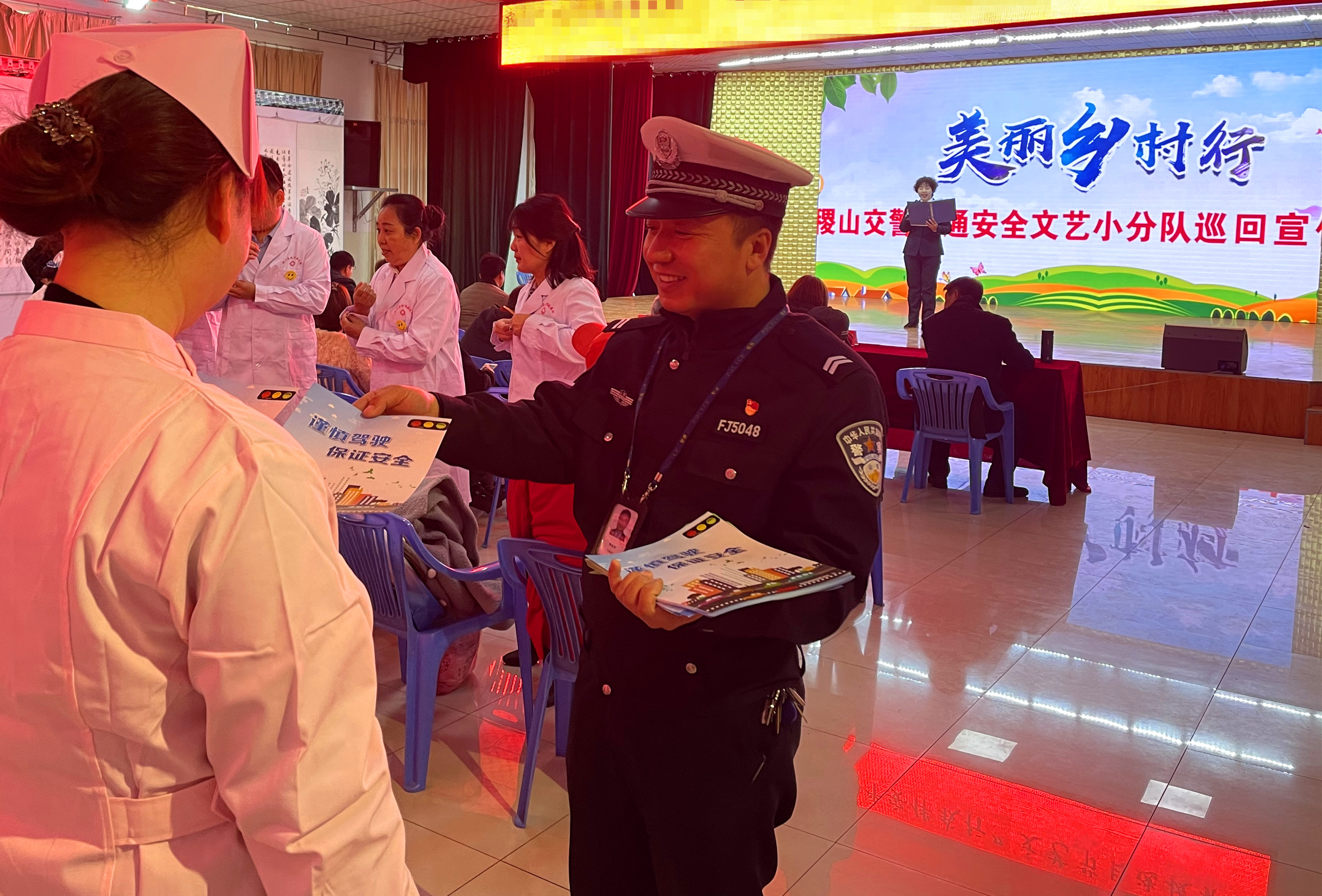 民警巧妙结合“平安伴我行”文艺节目选拨赛活动,在节目开始前,通过小品表演、唱歌、朗诵等表演形式,向各单位人员宣讲应注意的交通安全事项,台下观众都看的认真,有的拍照、有的录像,宣传民警借机手持宣传资料,边向他们进行发放,边以案说法,讲解酒驾醉驾、无牌无证、超员超速、开车接打电话、不按规定车道行驶、闯红灯等交通违法行为的危害,倡导他们在日常出行时,拒绝不文明交通违法行为,严格自律,自觉遵守交通规则,起一个好的模范带头作用。