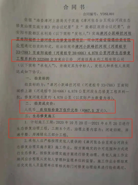 记者获得的一份安阳市殷都区水利局和恒禹公司签订的合同书显示,漳河小跃峰拦河坝至南阳城桥上游河段生态修复治理项目由安阳市殷都区水利局(发包人)实施,由河南省瑞德拍卖有限公司通过公开拍卖的形式将漳河小跃峰拦河坝(河道桩号33+788)至南阳城桥(河道桩号38+666)4.878公里河段生态修复工程弃料约322500立方米出让给河南恒禹水利工程有限公司(承包人)。拍卖成交价967.5万元。