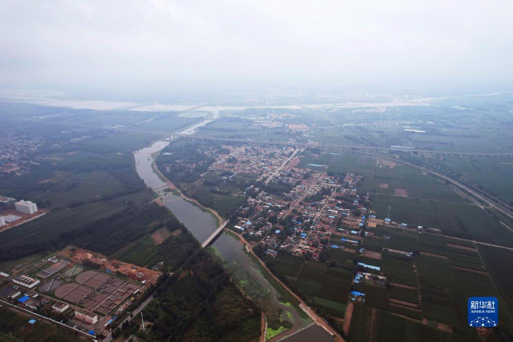 海子河畔负责处理化工园区污水的宁阳县磁窑镇污水处理厂(左下角)(9月2日摄,无人机照片)。新华社记者 刘诗平 摄