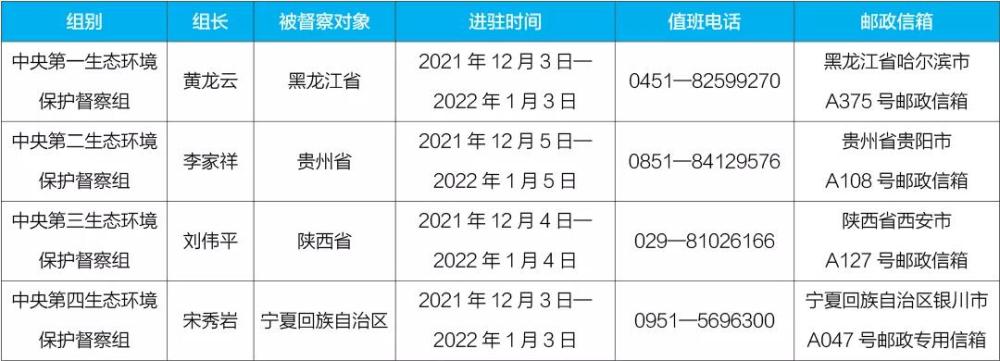 记者6日从生态环境部获悉,第二轮第五批4个中央生态环境保护督察组已经全部进驻,将对黑龙江、贵州、陕西、宁夏4个省(区)开展督察工作。