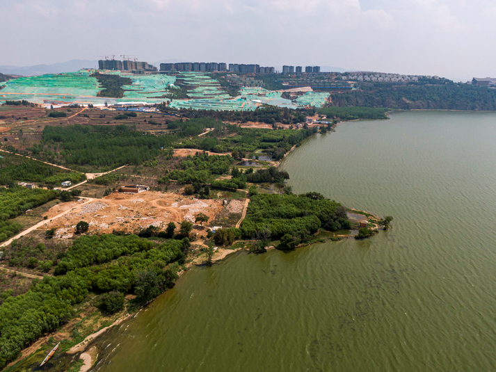 空中远眺滇池边的长腰山(2021年4月26日摄 无人机照片)