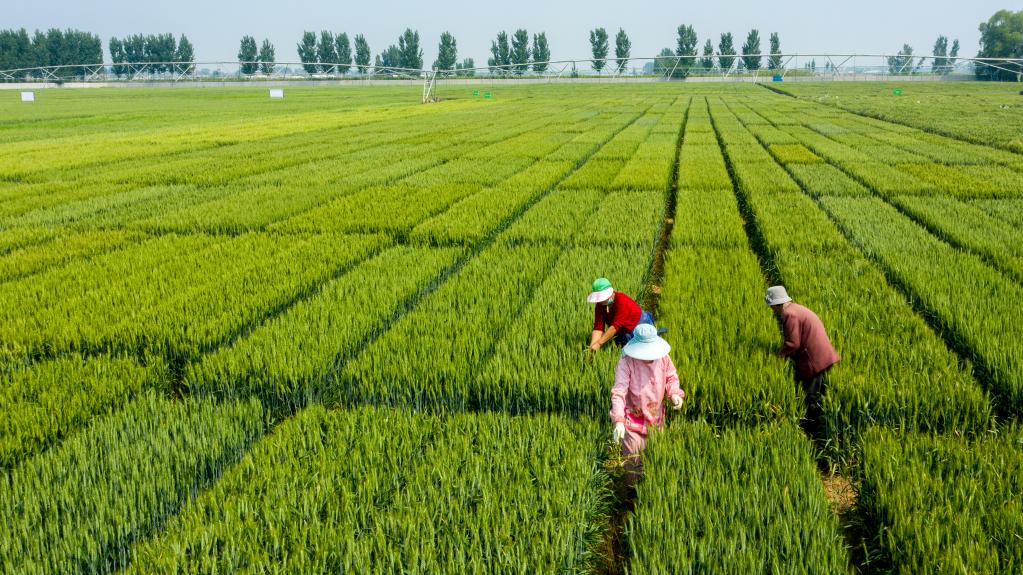 2021年5月12日,农民在河北辛集市马兰农场节水小麦田里劳作。(李秋华摄)