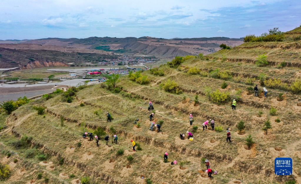 5月18日,人们在宁夏固原市西吉县硝河乡栽植苗木(无人机照片)。新华社记者 冯开华 摄