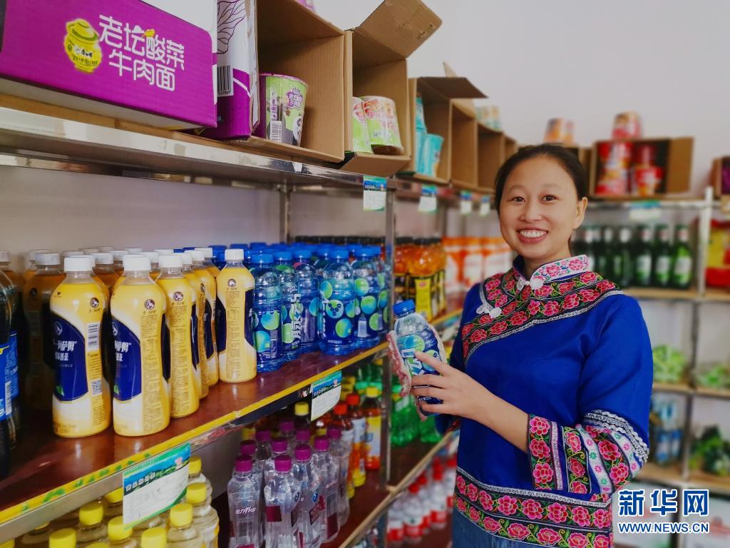 在四川省宣汉县巴山大峡谷桑树坪景点,王守英在自家开的商铺里整理商品(2020年9月19日摄)。新华社发(张平 摄)