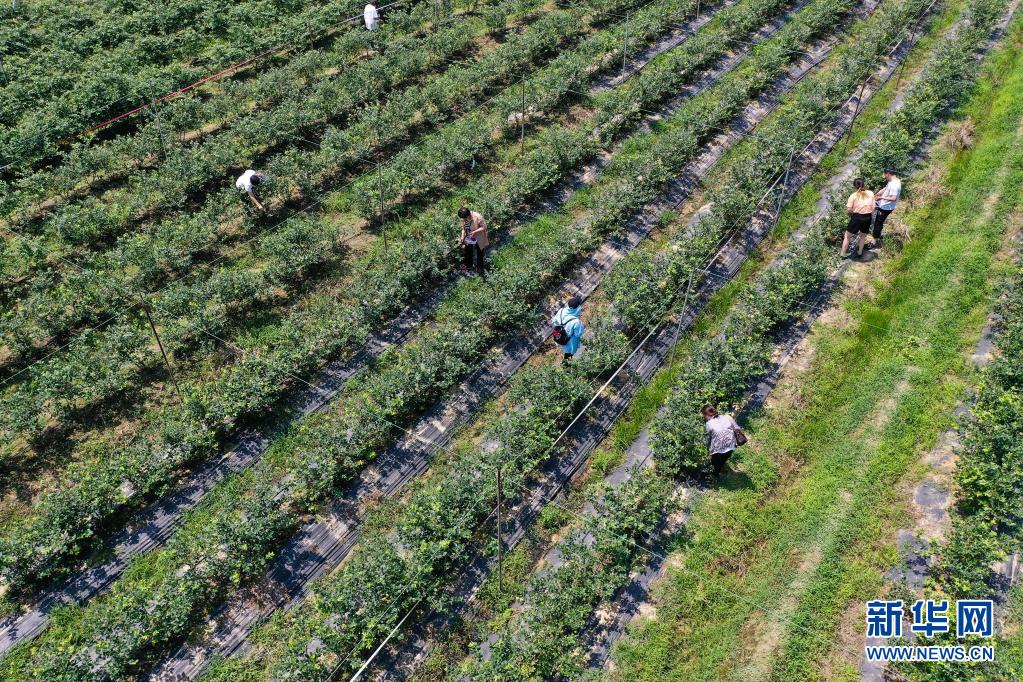 5月30日,人们在溧阳市白露山生态园采摘蓝莓(无人机照片)。