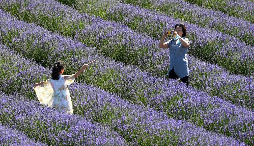 在新疆霍城县芦草沟镇四宫村,游客在薰衣草田里游玩(6月13日摄)。