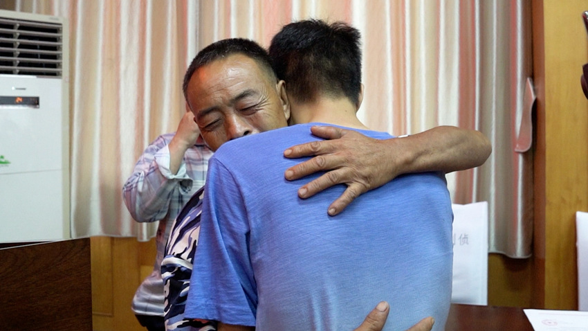7月9日上午,在绵阳市公安局刑侦支队会议室,滕跃山与儿子紧紧拥抱在一起。