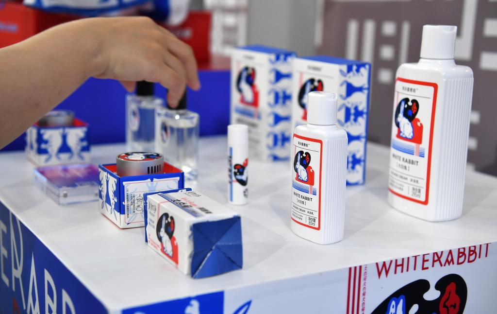 首届消博会上,用户体验大白兔奶糖周边产品。新华社记者 郭程 摄