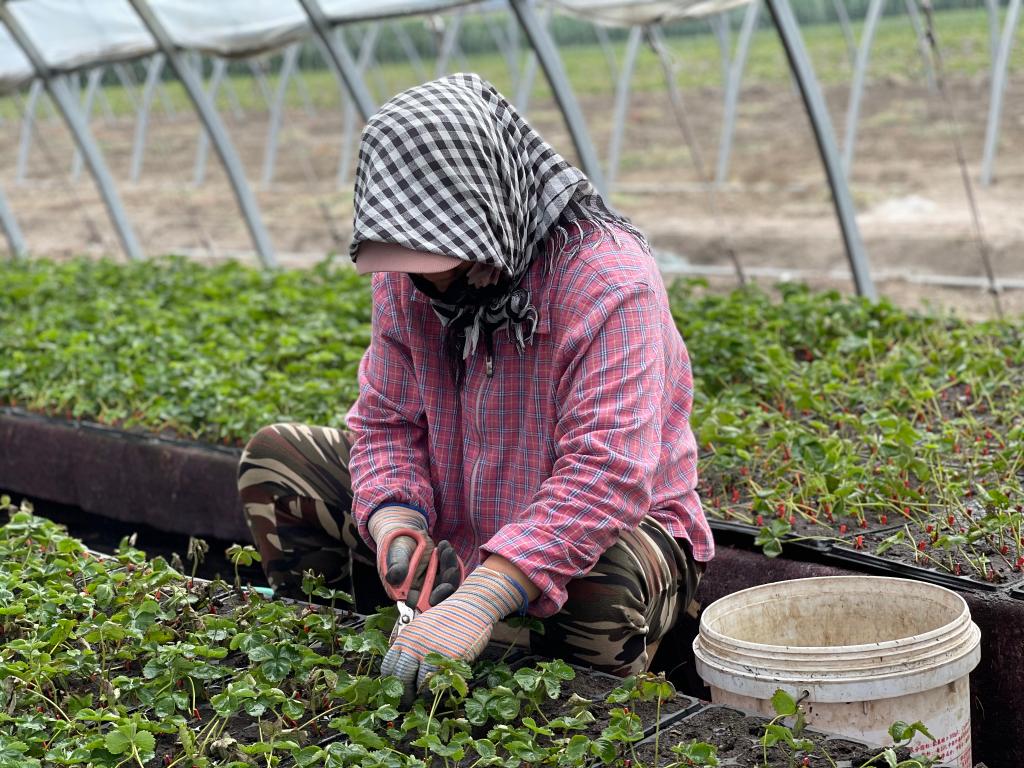 正午时分,她们眼神专注,头戴鸭舌帽,以头巾包裹,身穿被汗湿透的劳作服,右手拿着剪刀,左手扶着还未成形的草莓苗,麻利地剪掉周身杂草。