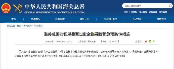 因从进口自巴基斯坦1批次冻金线鱼的1个外包装样本中检出新冠病毒核酸阳性,按照海关总署公告2020年第103号的规定,全国海关自即日起暂停接受巴基斯坦水产品生产企业M/S MARITIME FISHERIES(注册编号为T-445/2004)的进口申报4周。