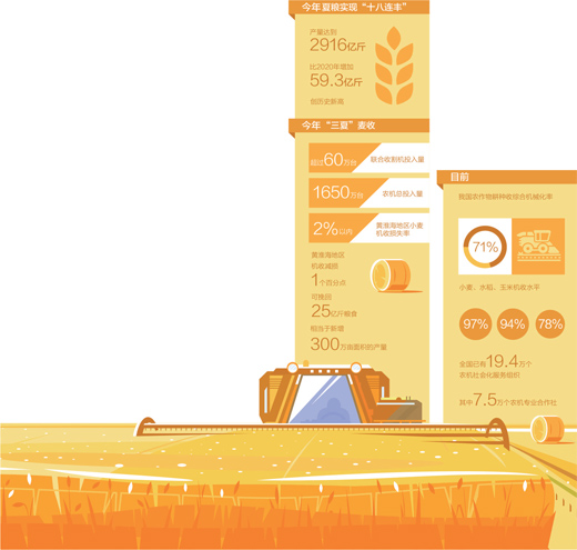 今年夏收,各地在机收减损上挖掘潜力,促进增产增收。据国家统计局数据,今年夏粮产量达到2916亿斤,比2020年增加59.3亿斤,单产、总产量均创历史新高。政策、种子、耕地、科技因素综合发力之外,夏粮丰收背后还有一个“隐形英雄”,那就是机收减损。农业农村部调度数据表明,今年夏粮主产区黄淮海地区小麦机收平均损失率控制在2%以内,较常年降低约1个百分点。