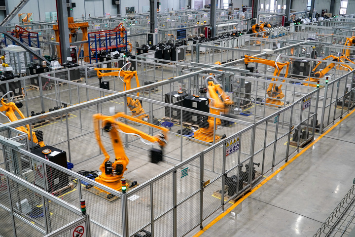 7月1日,在位于江苏省南京市江宁区的南京埃斯顿自动化股份有限公司工业机器人生产车间,工业机器人在进行跑合测试。新华社记者 李博 摄