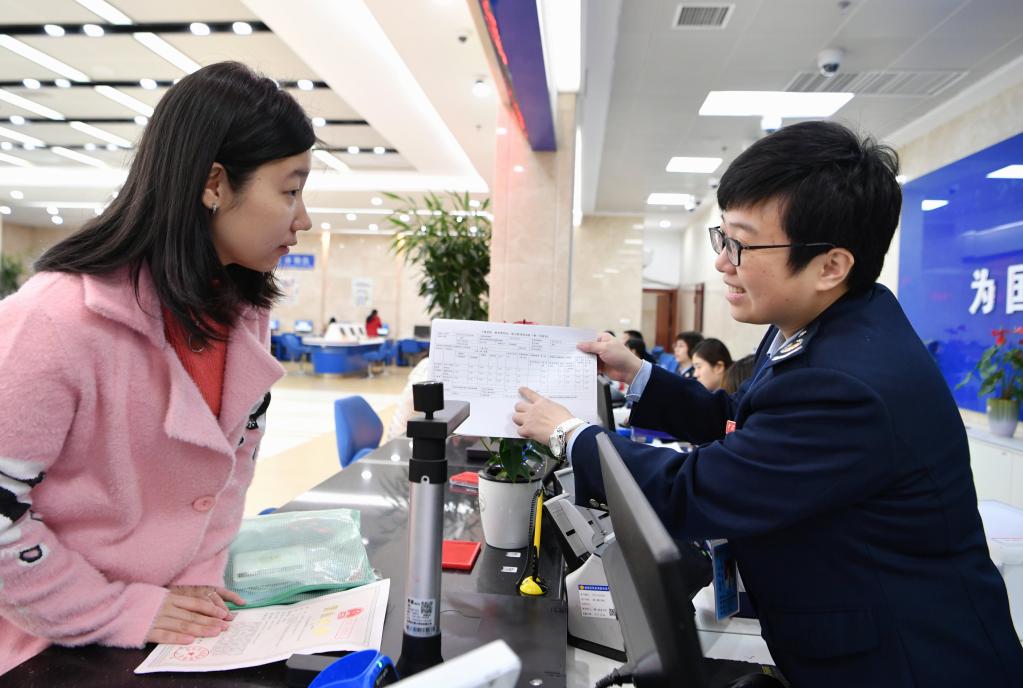 工作人员在国家税务总局福州市鼓楼区税务局办税服务大厅为企业财务人员介绍减税申报表的填写方法(2020年1月21日摄)。新华社记者魏培全 摄