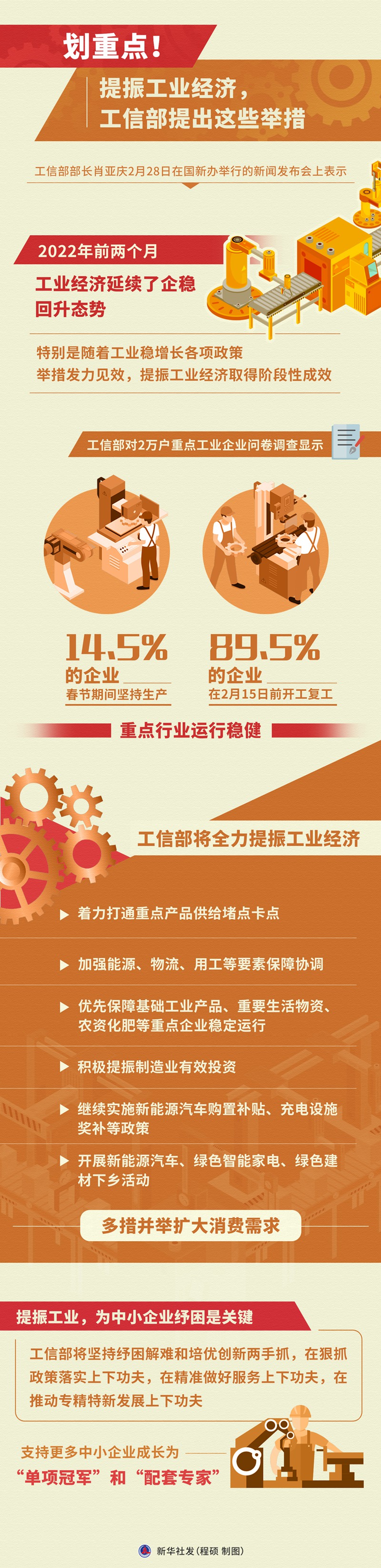 肖亚庆说,工信部将全力提振工业经济,着力打通重点产品供给堵点卡点,加强能源、物流、用工等要素保障协调,优先保障基础工业产品、重要生活物资、农资化肥等重点企业稳定运行,积极提振制造业有效投资,继续实施新能源汽车购置补贴、充电设施奖补等政策,开展新能源汽车、绿色智能家电、绿色建材下乡活动,多措并举扩大消费需求。