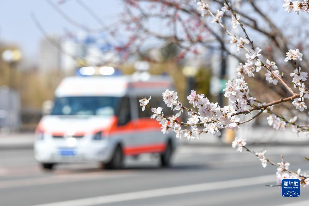 4月14日,一辆救护车在吉林市松江东路上驶过,路边桃花已经盛开。新华社记者 张楠 摄