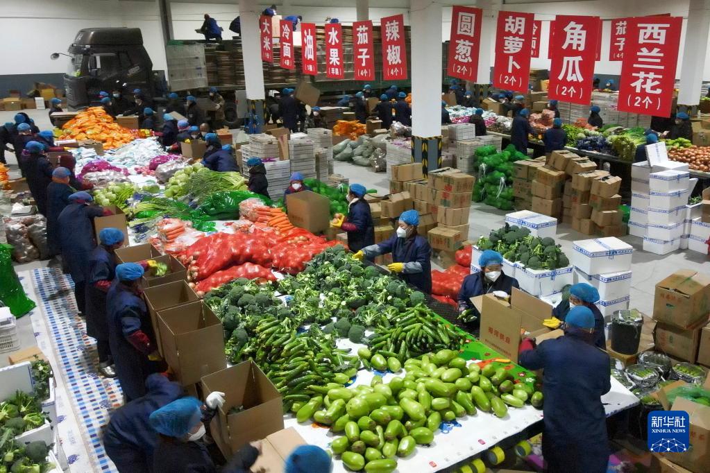 吉林省梅河口市工作人员进行“蔬菜包”菜品分拣(4月7日摄,无人机照片)。新华社发