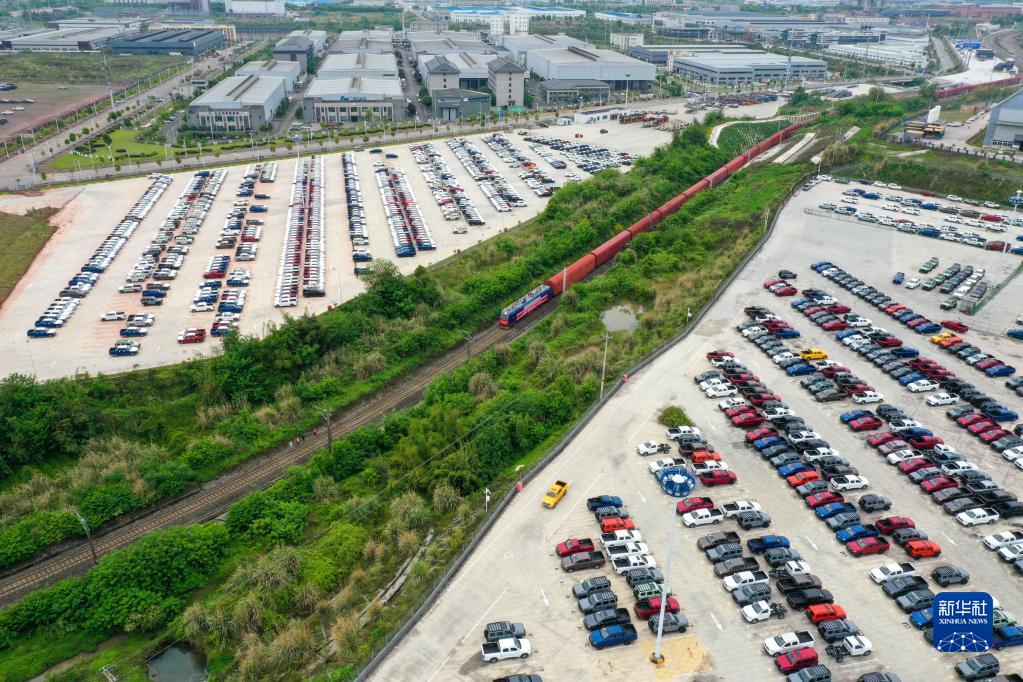 4月14日,长城汽车专列首发列车行驶在重庆永川国家高新区铁路专用线上(无人机照片)。新华社记者 唐奕 摄