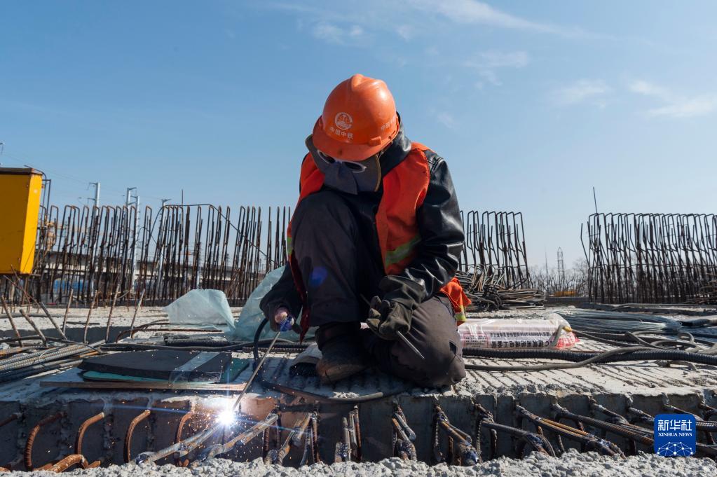 4月3日,在哈尔滨市道外区,工人在中铁一局北门街高架工程施工现场作业。新华社记者 谢剑飞 摄