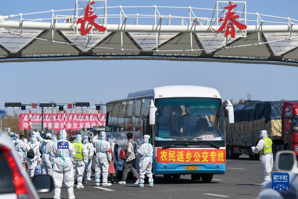 在吉林长春高速公路东出口,返乡农民登上返乡公交专线(4月12日摄)。新华社发