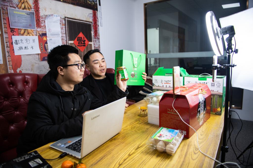 2022年2月22日,蒋连超(右)在湖南益阳市沅江高新技术产业园区与搭档一起直播带货。新华社记者 陈思汗 摄