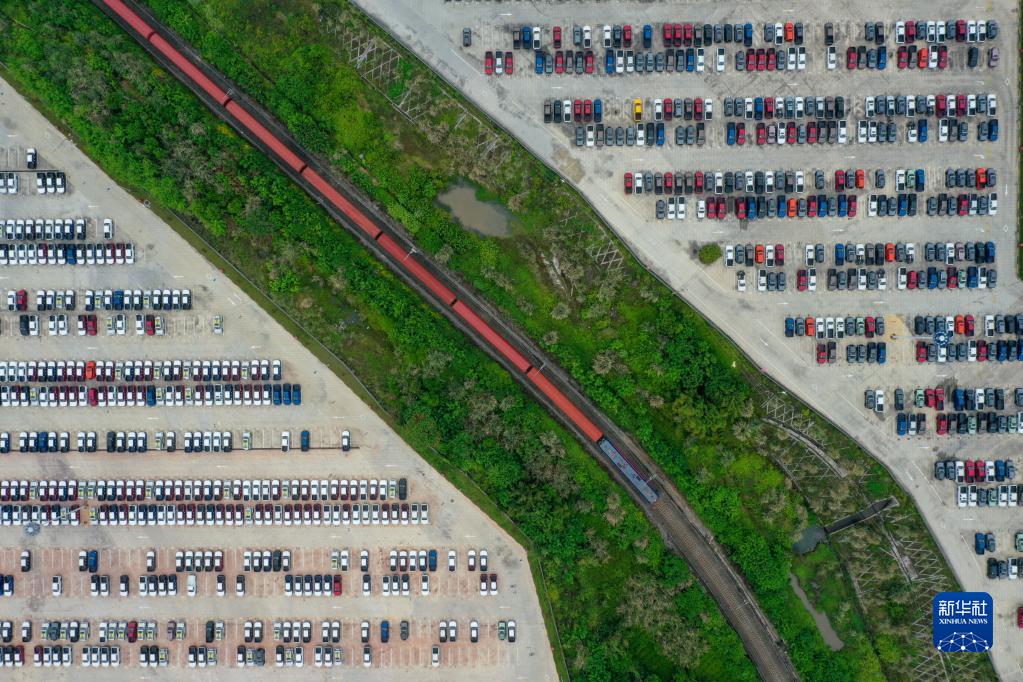 长城汽车专列首发列车在重庆永川国家高新区铁路专用线上(4月14日摄,无人机照片)。新华社记者 唐奕 摄