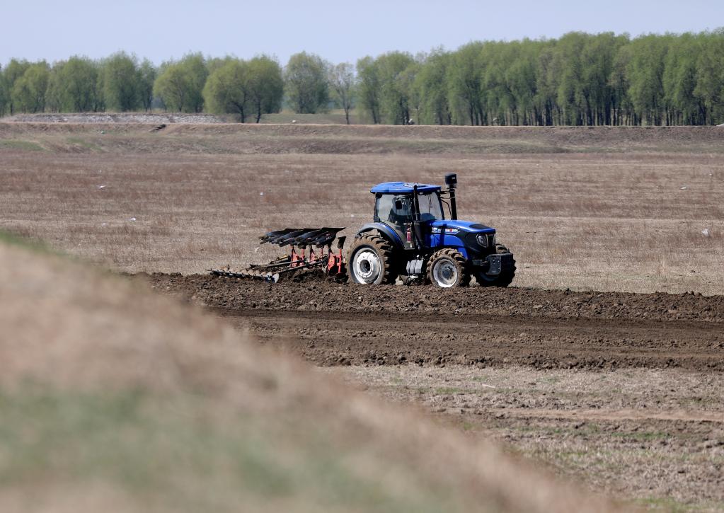 2022年4月22日,在辽宁省台安县达牛镇十四家子村大豆基地,农机手驾驶农机对农田进行翻耕。新华社记者 姚剑锋 摄