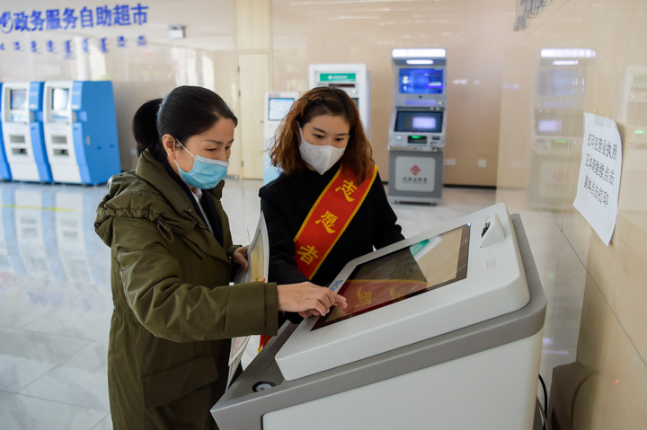 4月2日,在位于呼和浩特市玉泉区政务服务中心的“24小时政务服务自助超市”,一位市民在工作人员指导下打印营业执照。新华社记者李志鹏 摄