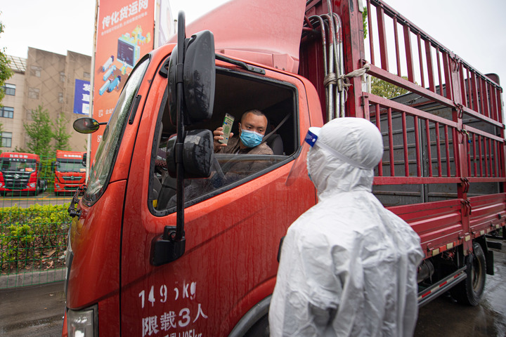 4月13日,工作人员查验驶入杭州传化公路港的货车司机健康码。新华社记者江汉 摄