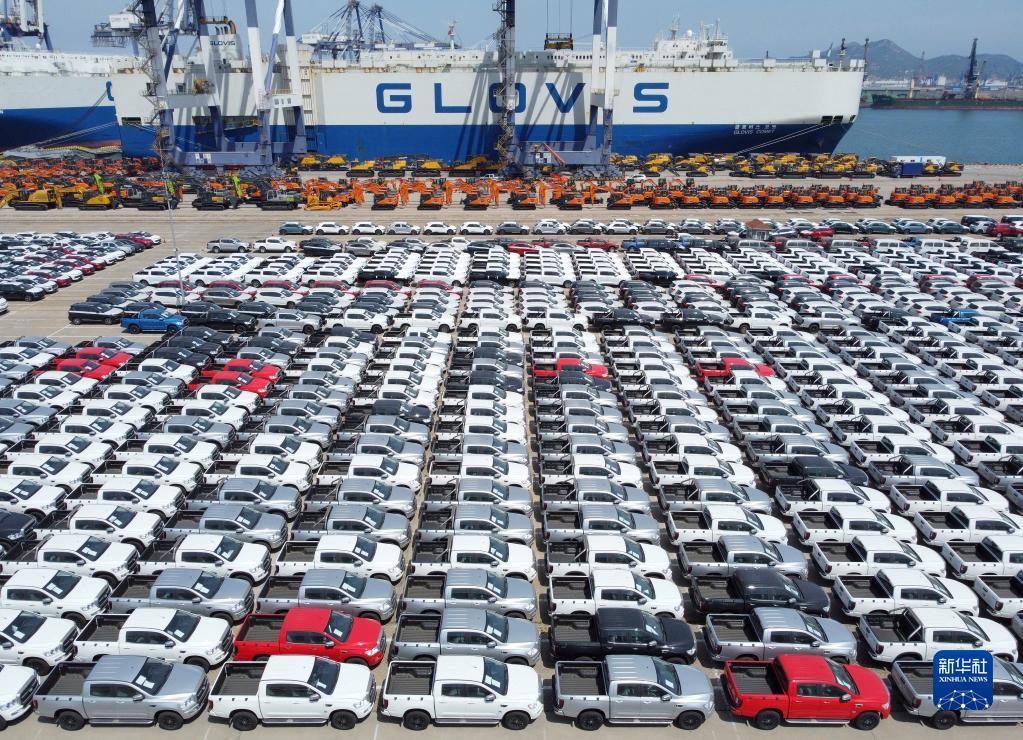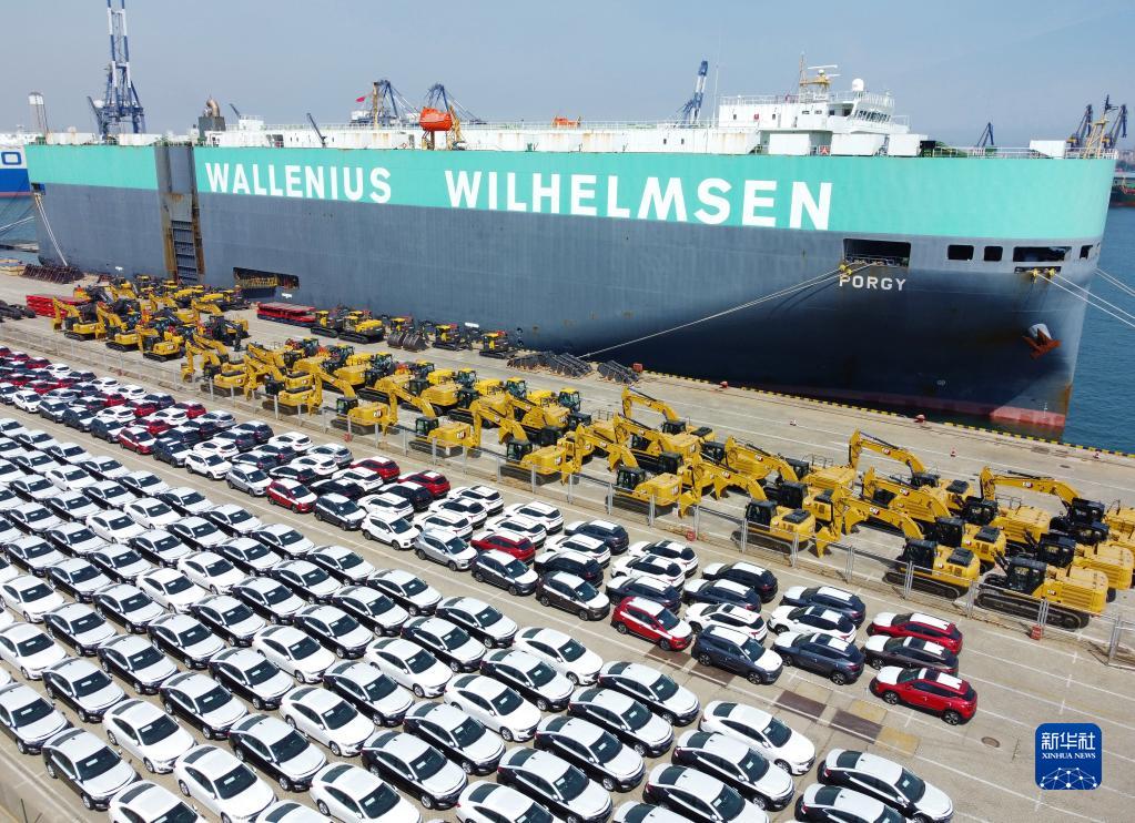 大批出口商品车在山东港口烟台港集结等待装船(5月9日摄,无人机照片)。新华社发(唐克摄)