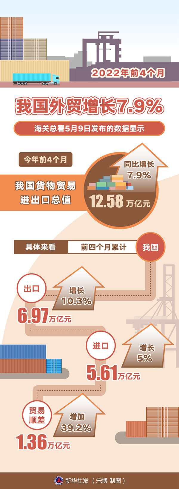 具体来看,前四个月累计,我国出口6.97万亿元,增长10.3%;进口5.61万亿元,增长5%;贸易顺差1.36万亿元,增加39.2%。