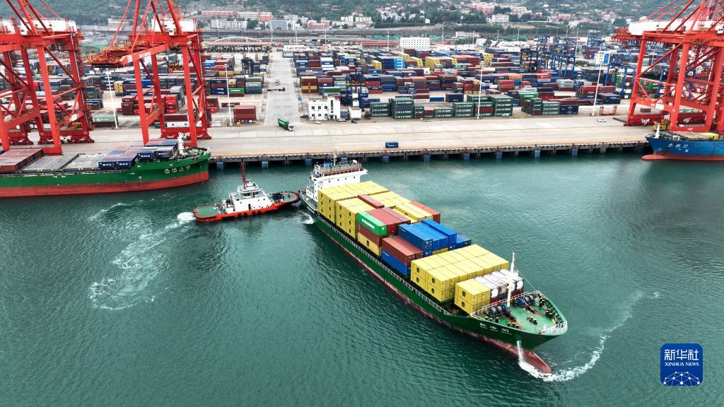 5月9日,在江苏省连云港港集装箱码头,货轮满载集装箱驶离泊位(无人机照片)。新华社发(王春摄)