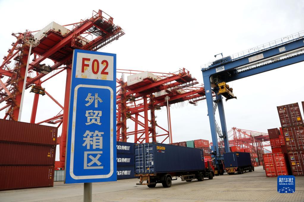 5月9日,在江苏省连云港港集装箱码头,运输车辆向货轮转运集装箱。新华社发(王春摄)